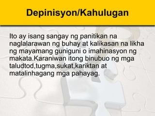 06012020 PANITIKAN Sa paksang ito ating aalamin at tutuklasin ang dalawang anyo ng panitikan at ang mga ibat ibang mga akda nito. Ang tugma ng mga salita sa dulo ng bawat taludtod ay ang nagbibigay dito ng sining at ganda.