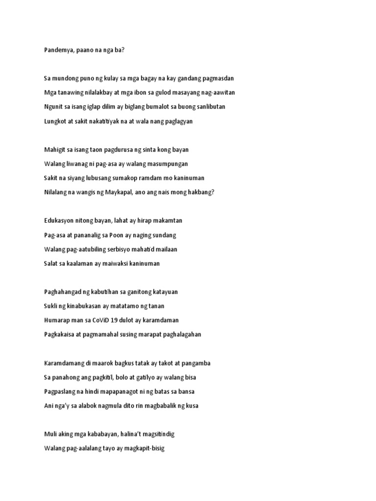 Tula tungkol sa pagkakaisa sa panahon ng pandemya. Nang dahil sa isang pandemiya Bawat tao at bansa ay walang magawa Ang dating malaya at masayang bansa Ngayoy namuhay sa takot at banta Hindi nakapaghanda sa dala nitong sakuna Paghahawak kamay ay naging armas Pagtitipon at pasimbay naging labag sa batas Minsan din pag kontrol sa taoy nauuwi sa dahas Tayoy naging mga ibon sa hawla hindi. Sa unang bahagi ng lockdown dahil sa coronavirus pandemic naglunsad ng hamon ang Rappler at ang. Aug 8 2020 930 AM PHT.