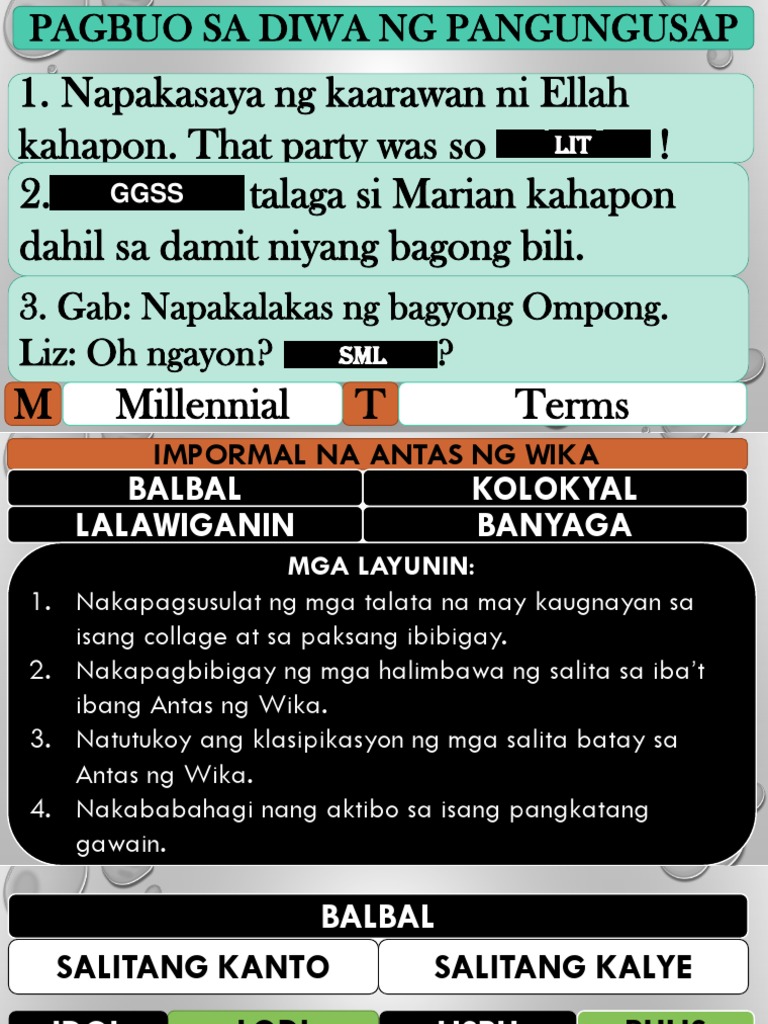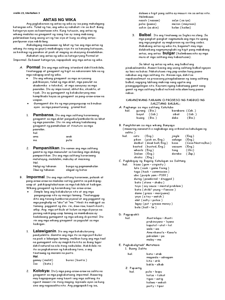 Nagkakaroon ng pagbabago ang wika sa taong nagsasalita o gumagamit ng wika. Antas ng Wika Batay sa Pormalidad. May hika asthma - may allergy mahina ang isip o matalino - special child sasakyan - wheels tunog o musika - sounds.